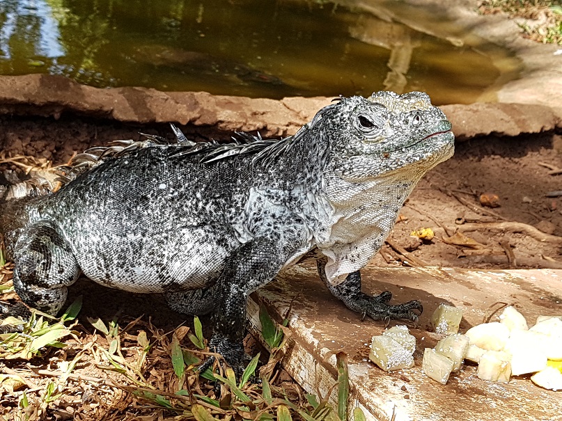 La iguana negra Swampy, de 26 años de edad, es el ejemplar más antiguo que habita la estación científica, en donde tienen un proyecto de crianza y conservación de iguanas negras de cola espinosa. Foto: Staff IRBS-Iguana Station