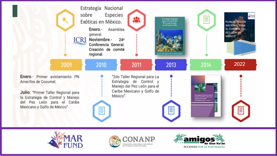Línea de tiempo del trabajo realizado a la fecha para el control del pez león invasor en México. Foto: Rosa María Loreto
