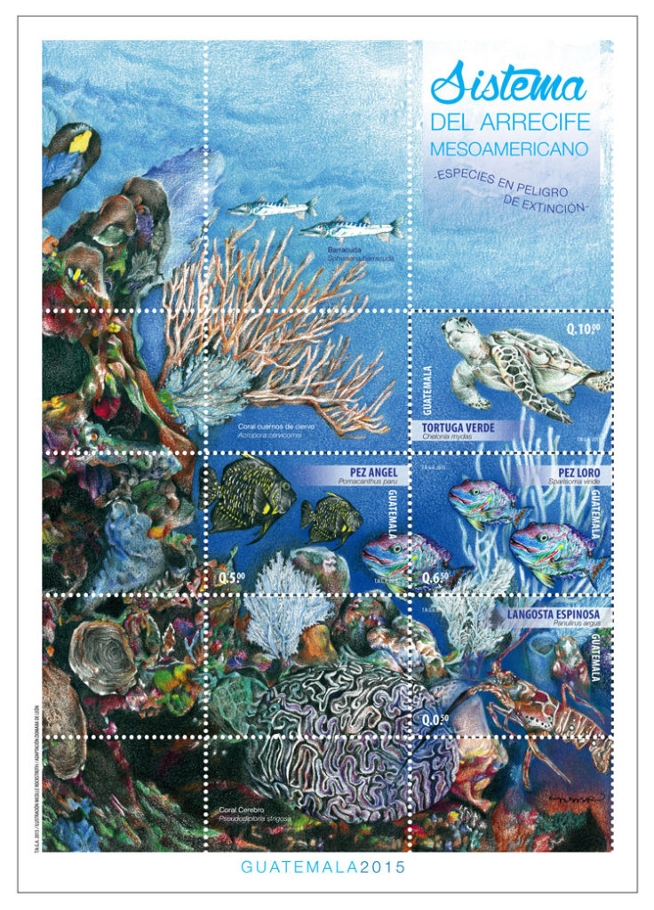 La idea principal fue diseñar e imprimir un juego de sellos postales que acompañaran una serie de eventos para celebrar la creación del Fondo para el Sistema Arrecifal Mesoamericano – Fondo SAM -. La idea de diseñar estos sellos postales fue plasmar en la historia la importancia que tiene esta importante región marino costera para las comunidades que viven alrededor del arrecife, los sellos reflejan la belleza escénica del arrecife, las especies marinas que este alberga y que se encuentran en peligro de extinción, las personas y comunidades de personas que viven de los recursos naturales y culturales del arrecife y finalmente visibilizar las bondades de mantener saludables los ecosistemas en esta región compartida entre Guatemala, México, Belice y Honduras. Los diseños fueron aprobados por la el Consejo Nacional Filatélico de Guatemala.