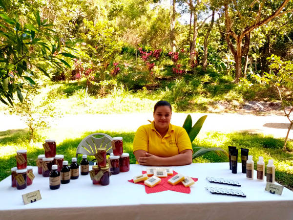 Doris Flores, integrante de la APICOR, muestra la miel, jabón, crema y champú que fabrican en APICOR y que comercializan bajo la marca Island Honey. Foto: APICOR