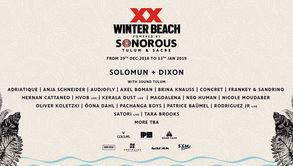 [vc_row][vc_column][vc_column_text]Una de las fiestas más seductoras de invierno es el XX Winter Beach que este año se realiza en Tulum y Sacbé, escucha aquí a los primeros artistas anunciados.[/vc_column_text][/vc_column][/vc_row][vc_row][vc_column width=”1/4″][/vc_column][vc_column width=”1/2″][vc_raw_html]JTNDY2VudGVyJTNFJTNDaWZyYW1lJTIwc3JjJTNEJTIyaHR0cHMlM0ElMkYlMkZvcGVuLnNwb3RpZnkuY29tJTJGZW1iZWQlMkZ1c2VyJTJGZmVzdGl2YWxwYXNzcG9ydCUyRnBsYXlsaXN0JTJGMWZjRjhXU2tGbzFvSUs0aUZpTHNneCUyMiUyMHdpZHRoJTNEJTIyMzAwJTIyJTIwaGVpZ2h0JTNEJTIyMzgwJTIyJTIwZnJhbWVib3JkZXIlM0QlMjIwJTIyJTIwYWxsb3d0cmFuc3BhcmVuY3klM0QlMjJ0cnVlJTIyJTIwYWxsb3clM0QlMjJlbmNyeXB0ZWQtbWVkaWElMjIlM0UlM0MlMkZpZnJhbWUlM0UlM0MlMkZjZW50ZXIlM0U=[/vc_raw_html][/vc_column][vc_column width=”1/4″][/vc_column][/vc_row][vc_row][vc_column][vc_column_text]Música y moda se unen en XX Winter Beach un evento organizado por Sonorus donde podemos escuchar a grandes djs de la electrónica subterránea. Este año las sedes serán Tulum y Sacbé en la Riviera Maya, del 29 de diciembre al 13 de enero podremos escuchar a Solomun + Dixon, Adriatique, Anja Schneider, Audiofly, Axel Boman, Brina Knaus, Concret, Frankey & Sandrino, Hernan Cattaneo, Hvob (live), Kerala Dust (live), Magdalena, Neo Human, Nicole Moudaber, Oliver Koletzki, Öona Dahl, Pachanga Boys, Patrice Baümel, Rodríguez Jr (live), Satori (live) y Tara Brooks.